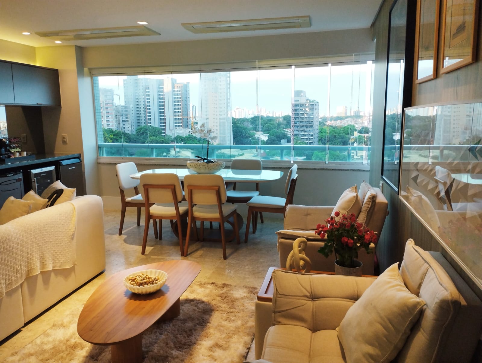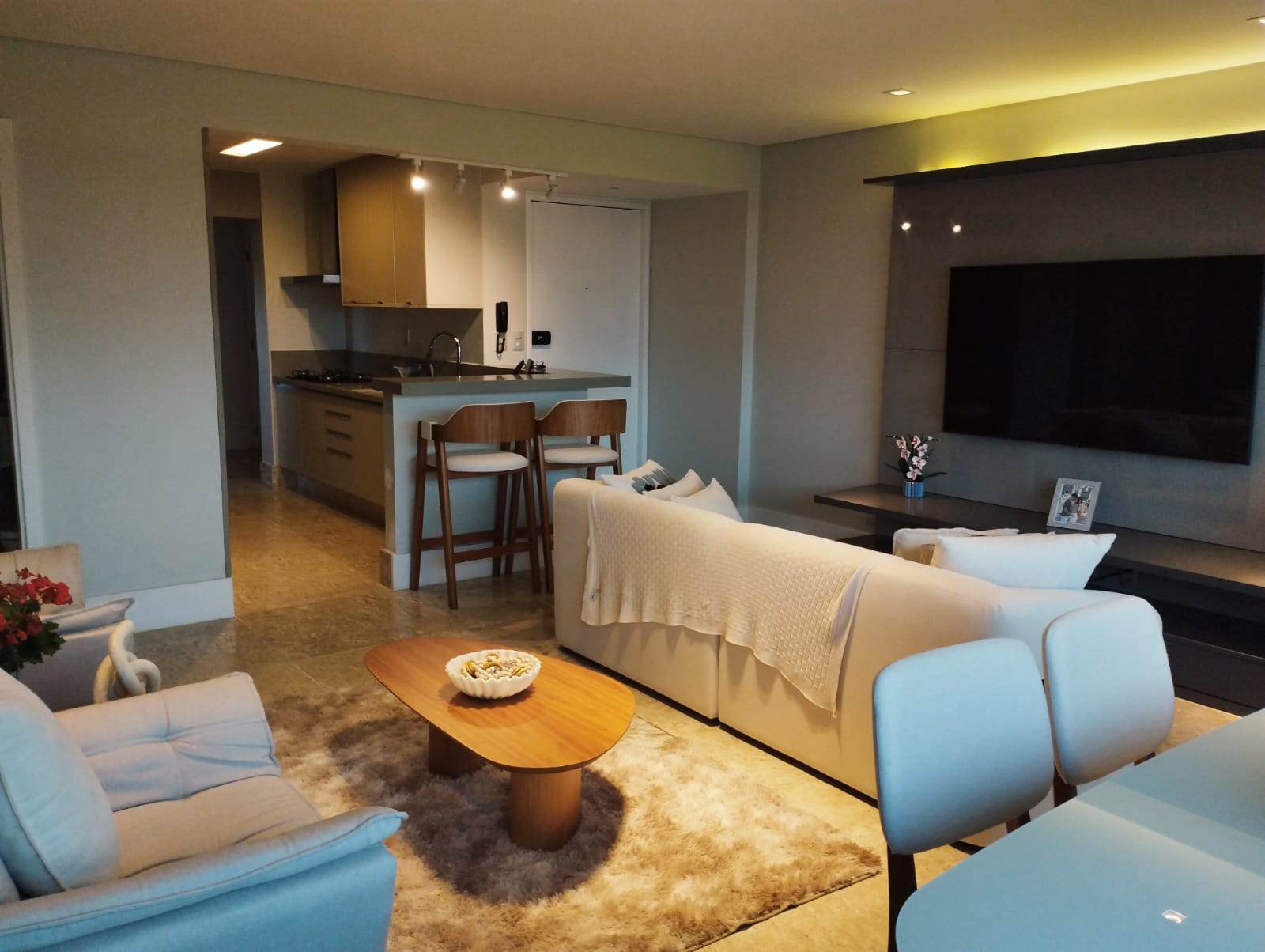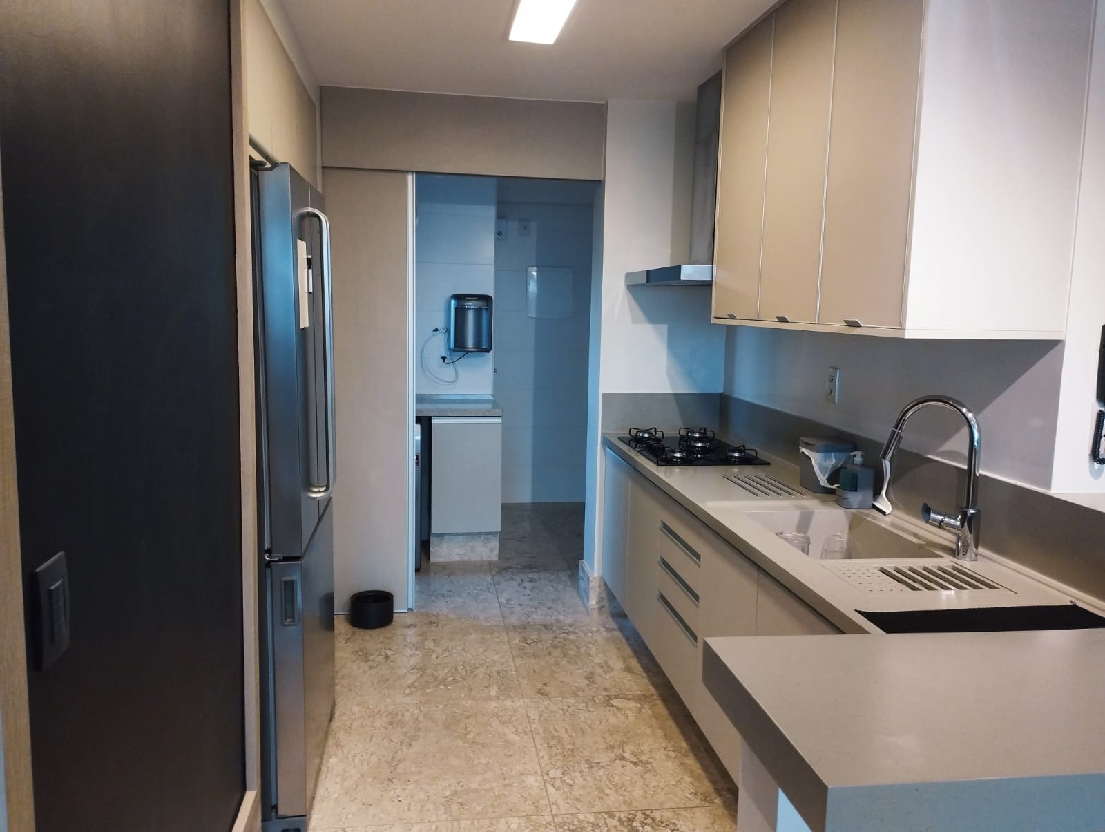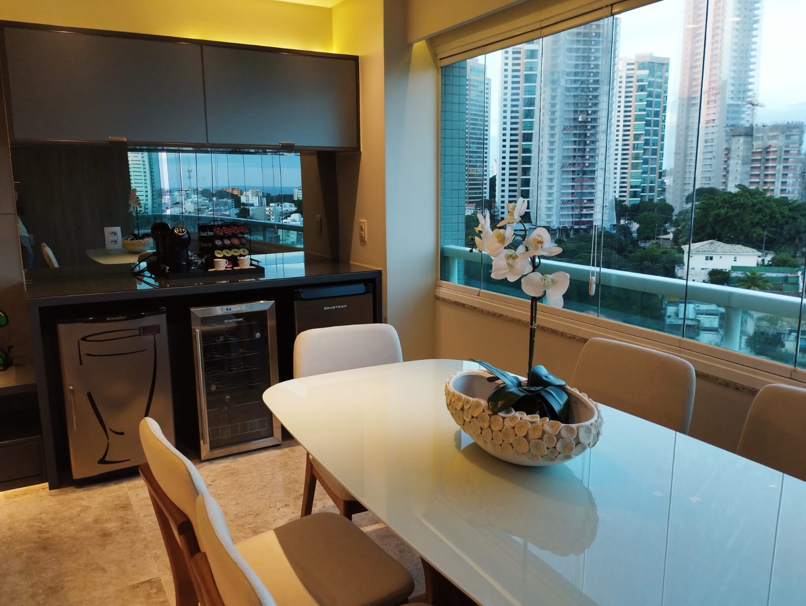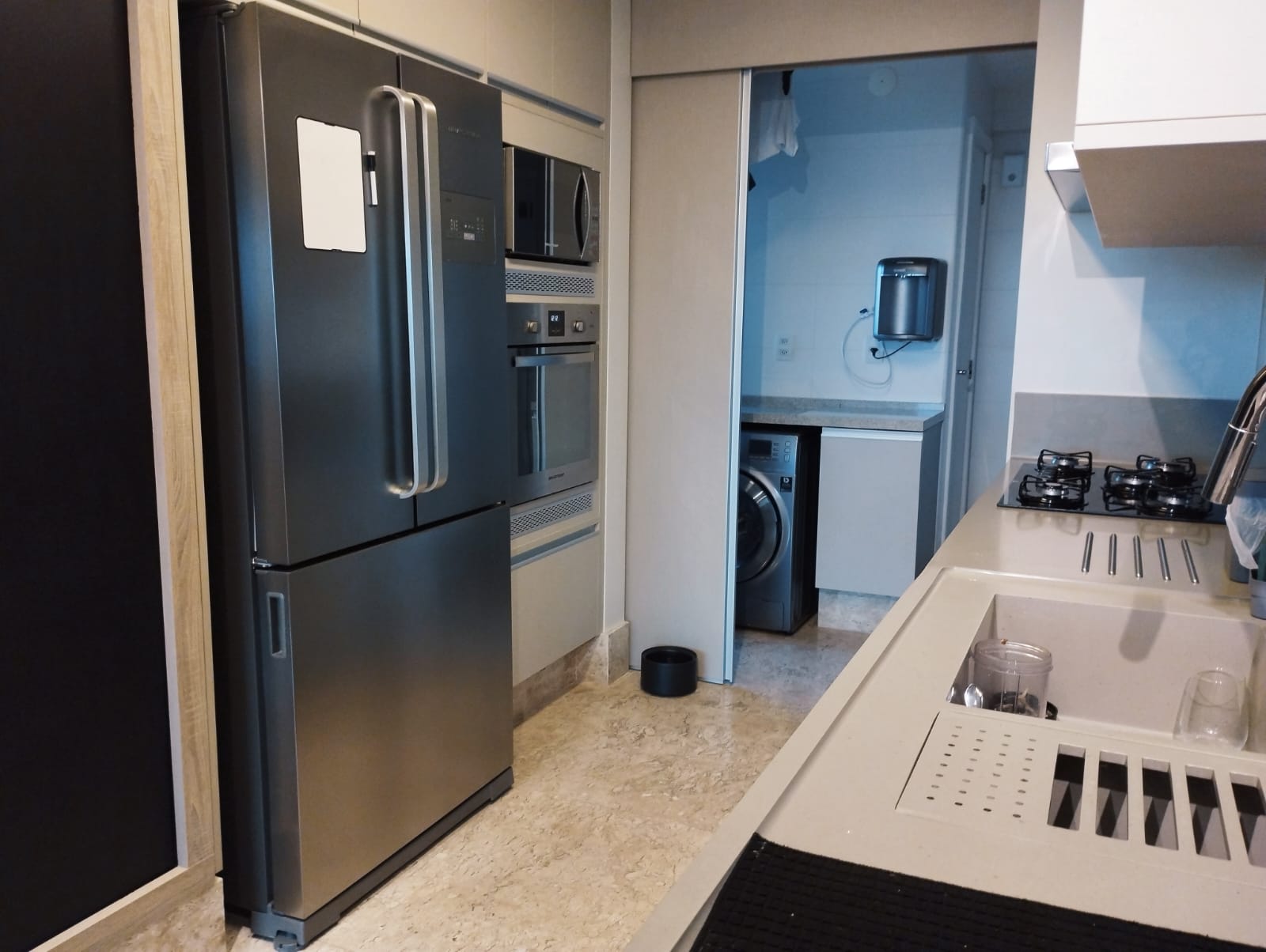 A cozinha, elegantemente planejada e equipada com armários embutidos, une funcionalidade e requinte. Aqui, todos os detalhes foram pensados para facilitar a rotina: já estão inclusos geladeira, máquina de lavar, forno, micro-ondas, lava-louças, fogão, cervejeira, adega e todos os móveis planejados — proporcionando praticidade e exclusividade dignas dos melhores empreendimentos de alto padrão. A área de serviço é funcional e discreta, mantendo o ambiente social sempre impecável.