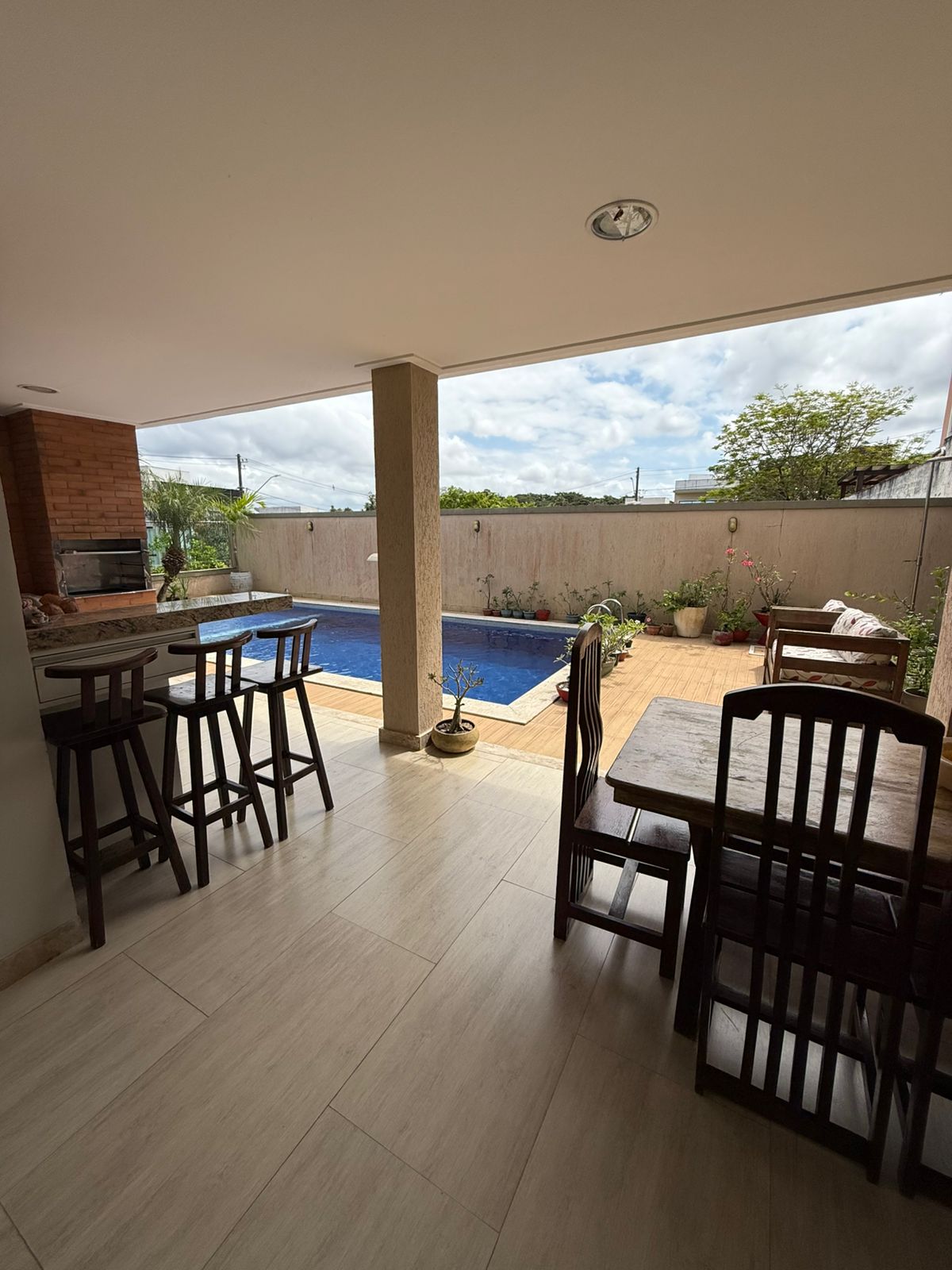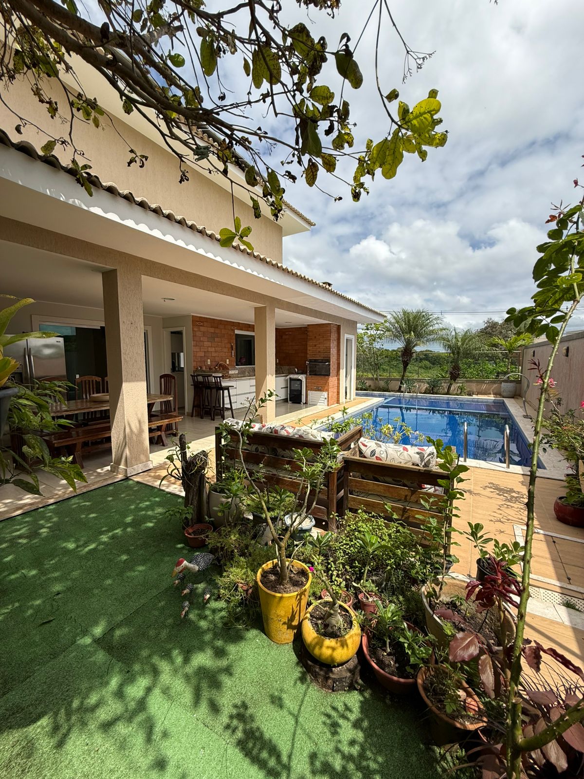 A cozinha conta com despensa e um espaço gourmet com churrasqueira, perfeito para receber amigos e familiares. Varandas no piso superior e inferior ampliam a área social e proporcionam momentos de lazer ao ar livre. A piscina com hidromassagem integrada, jardins planejados e áreas verdes completam o cenário ideal para relaxamento.